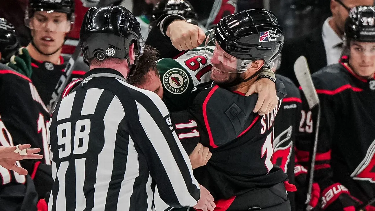 Staal was involved in his first fight since February 2017, when he rushed Minnesota’s Tyler Pitlick in the first period after Pitlick’s blow to the head of Hurricanes defenseman Jalen Chatfield.