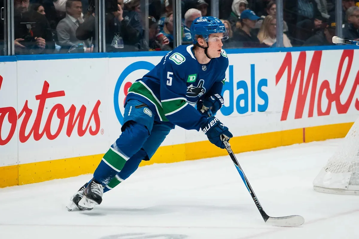 Despite only being 20, the defenceman has played excellently throughout his first few NHL games, resulting in him skating in games during which defenceman Elias Pettersson and Pierre-Olivier Joseph were healthy-scratched in his stead.
