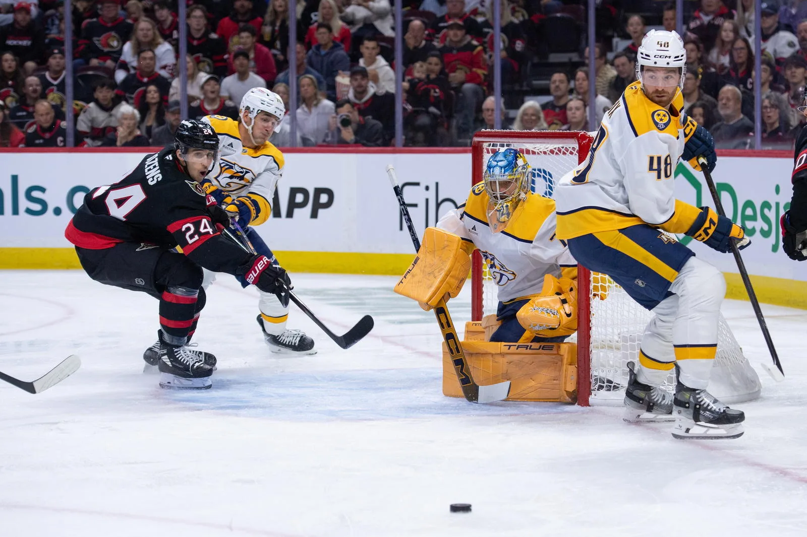 Oct 13, 2025; Ottawa, Ontario, CAN; Ottawa Senators center Dylan Cozens (24) and Nashville Predators defenseman Nick Perbix (48) track the puck following a save by goalie Juuse Saros (74) in the first period at the Canadian Tire Centre. Marc DesRosiers-Imagn Images