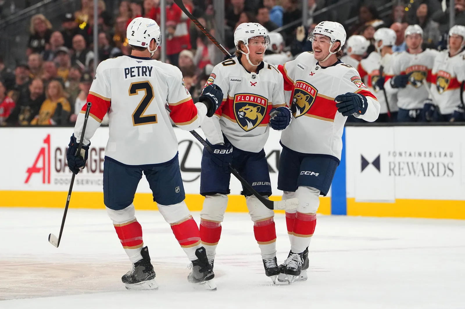 Photo caption: Nov 10, 2025; Las Vegas, Nevada, USA; Florida Panthers center Jesper Boqvist (70) celebrates with defenseman Jeff Petry (2) and defenseman Donovan Sebrango (6) after scoring a goal against the Vegas Golden Knights during the first period at T-Mobile Arena. (Stephen R. Sylvanie-Imagn Images)
