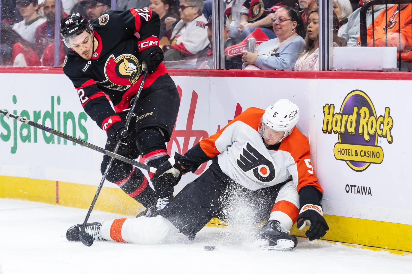 As for the injured Ethan Samson, I spotted him sporting a brace or cast of sorts on his right hand in the elevator after the game, and he was declared out 6-to-8 weeks by the Flyers last week anyway.