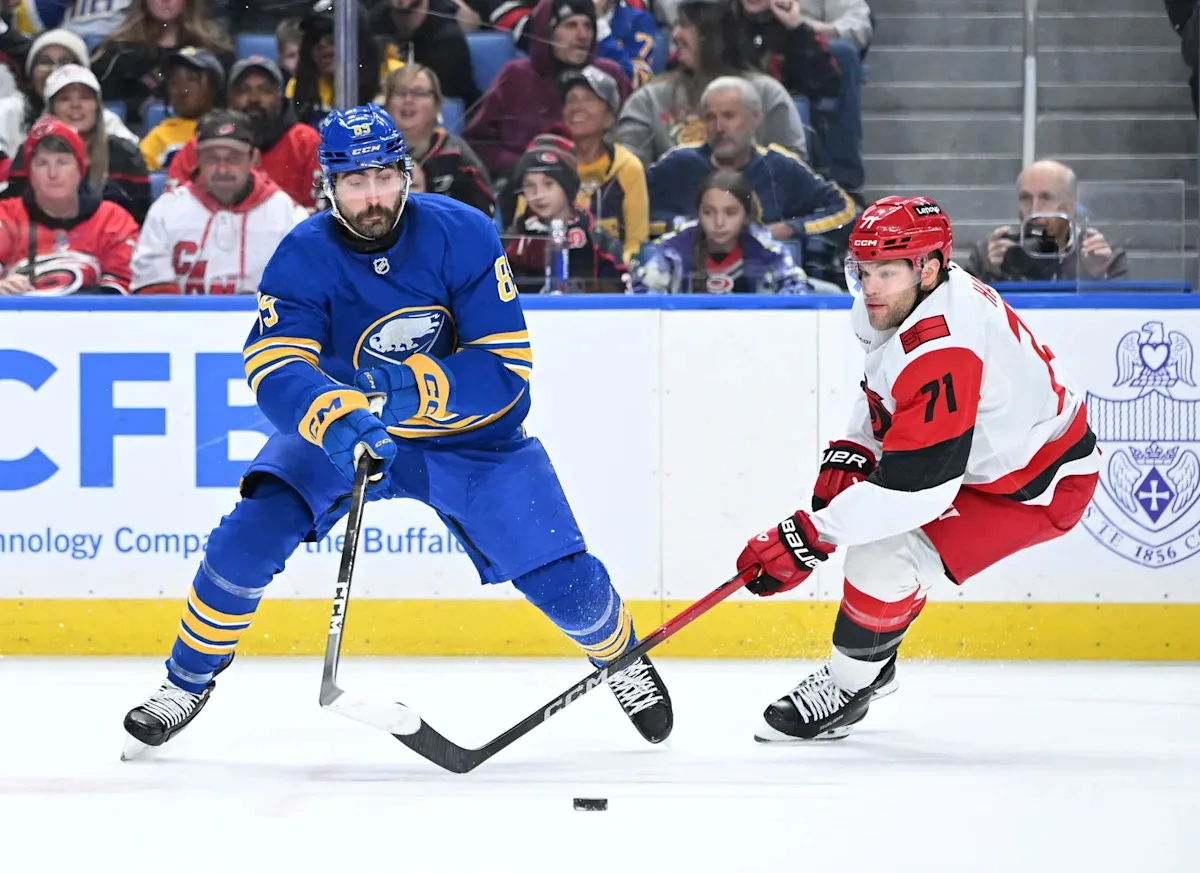 Taylor Hall, Eric Robinson, William Carrier, Mark Jankowski – F: The 34-year-old former Hart Trophy winner is playing for his seventh NHL club and will likely finish out his NHL career in Carolina after signing a three-year extension last April with a no-movement clause. Hall has 13 points (5 goals, 8 assists) in 26 games. Robinson, Carrier, and Jankowski each spent one season in Buffalo, and all are serving in depth roles for the Hurricanes. Robinson has five goals in 20 games, while Carrier and Jankowski each have one goal this season.